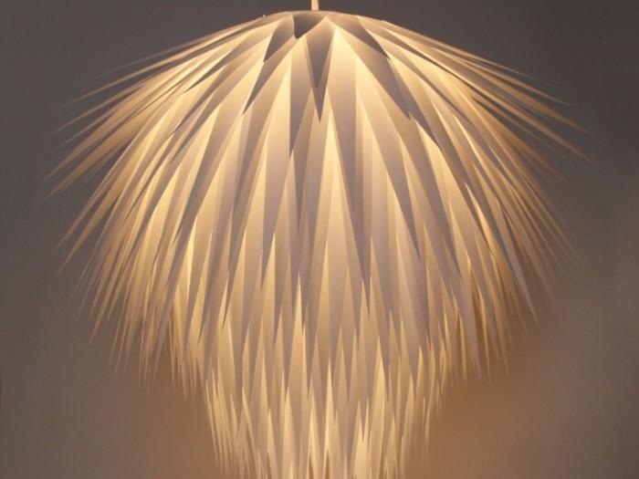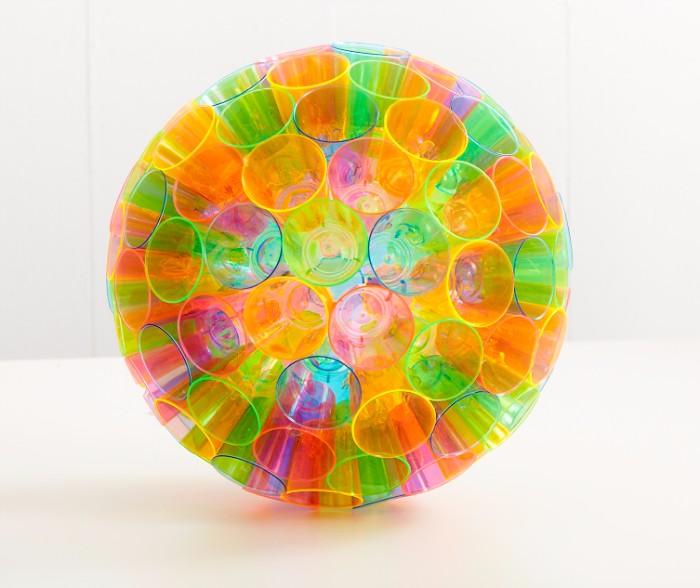 Также элементарно делается абажур из одноразовых пластиковых стаканчиков, которые скрепляются степлером. Данный абажур имеет достаточно неплохие светотехнические характеристики, но при этом вид достаточно утилитарен. Такой абажур хорошо подойдет для помещений в которых необходимо качественное освещение, но не обязателен эстетический внешний вид.