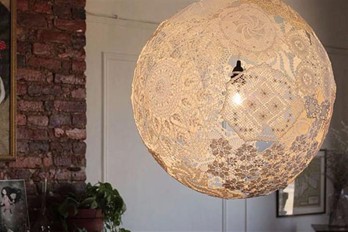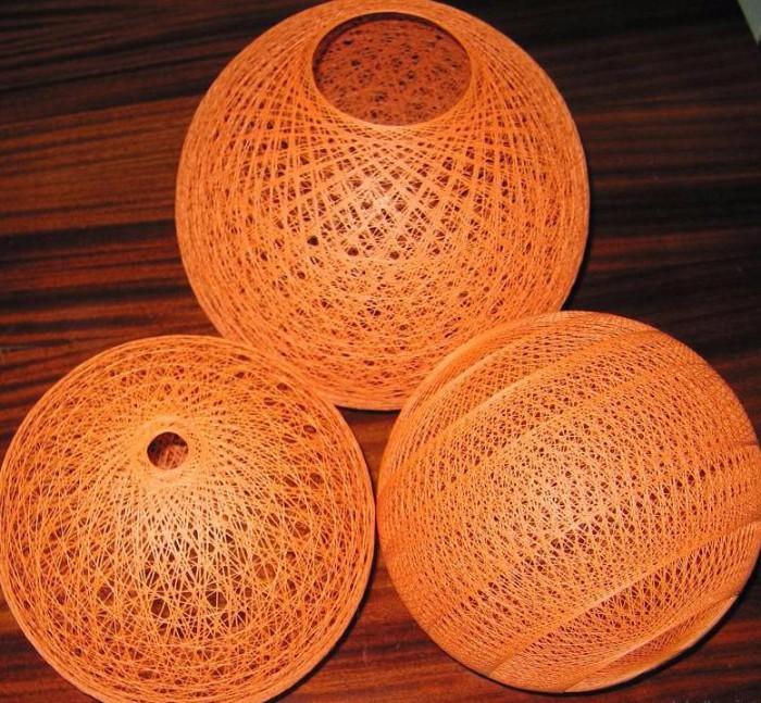 При изготовлении абажура из нитей вам понадобится не менее 100 м. Не имеет смысла использовать надувные шары, как оправки, ведь после 10−20 витков шар начнет выпячиваться в разные стороны и испортит форму. Лучше всего для оправки задействовать туго надутый, прочный мяч. Оправку необходимо смазать вазелином. Далее, предварительно смазав клеем, наматывать нить на мяч. При намотке не забудьте оставить отверстие для кабеля и патрона. Спустя сутки, нужно сдуть оправку, которая, благодаря вазелину, не прилипнет к ниткам. Также нитки можно заменить на джутовый, сизалевый или пропиленовый шпагат.