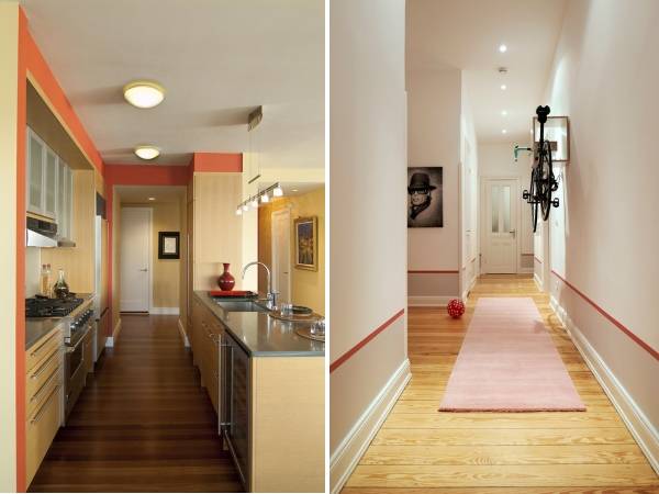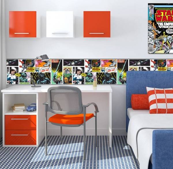 В первую очередь, давайте рассмотрим современные декоративные бордюры, которые имеют узкую ширину. Такие окантовки для обоев могут применяться, чтобы подчеркнуть границы между стенами и потолком, украсить карниз над окнами, выделить дверные рамы и подвесные шкафчики. Иногда обойные бордюры клеятся посередине стены, чтобы разделить два вида обоев или просто придать комнате необычный вид. Чаще всего такой дизайн стен можно наблюдать в детских комнатах или на кухнях, где для нижней части стен выбирают более темный оттенок, чем для верхней (из практических соображений). Тематические бордюры для обоев также могут устанавливаться чуть выше плинтусов, но наиболее интересным, пожалуй, является вертикальный способ поклейки бордюров, благодаря которому интерьер кажется выше и просторнее.