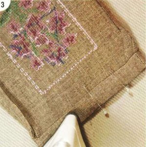2. Так как в нашем случае вышивка сделана прямо на мешочке, мы размечаем середину на одной из половинок, для этого складываем заготовку 2 раза пополам и отмечаем серединку ниткой или карандашом.