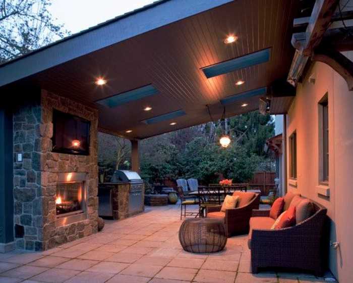 Обширная терраса может быть оборудована не только при входе в дом, но и по всему его периметру. Это хороший вариант для любителей проводить больше времени на природе.