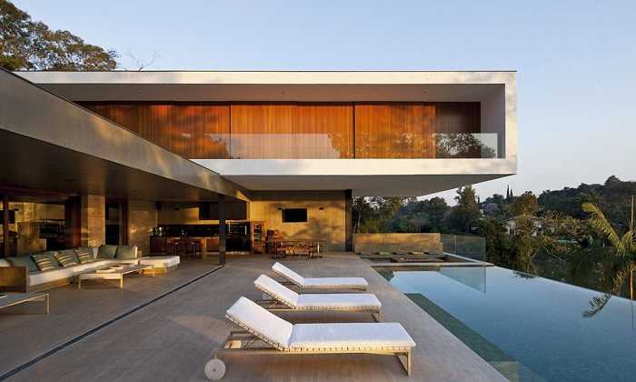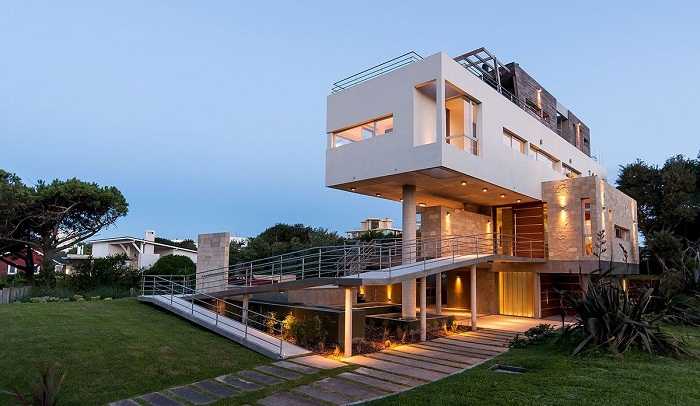 Применение бетонных плит значительно ускоряет и удешевляет процесс строительства, по сравнению с деревянными конструкциями. С использованием бетона можно соорудить красивые частные дома (фото представлены ниже) в современных стилях, таких как минимализм, лофт или хай тек. Для того, чтобы придать подобной конструкции визуальную легкость, зачастую применяют панорамные окна. Можно также облицевать фасады другими отделочными материалами.