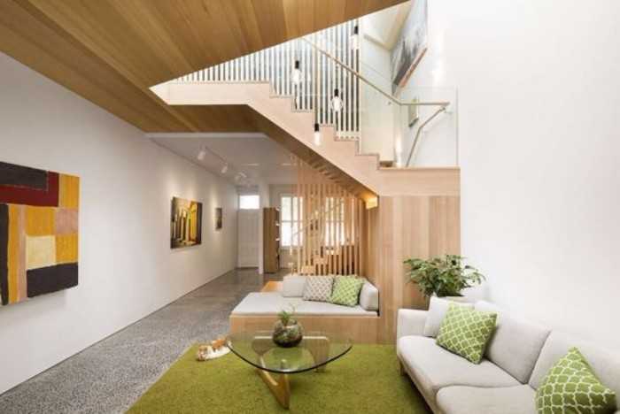 Как правило, первый этаж предназначается для совместного отдыха всей семьей или приезда гостей. Здесь оборудуется большая гостиная, возможно, совмещенная с кухней. Второй этаж отводится под индивидуальные пространства: спальни, детские и пр.
