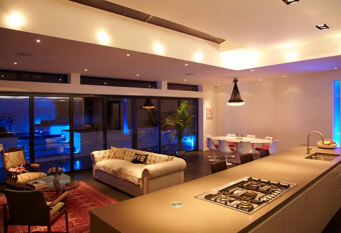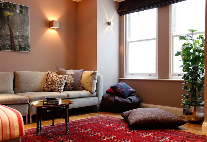Вечерние освещение меняет цвет стен гостиной, придаёт им очень мягкий оттенок-цвета каппучино.