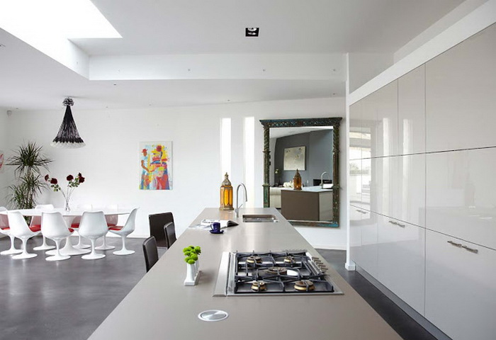 Интерьер гостиной объединяет три зоны: столовую, кухни и каминную зону.
