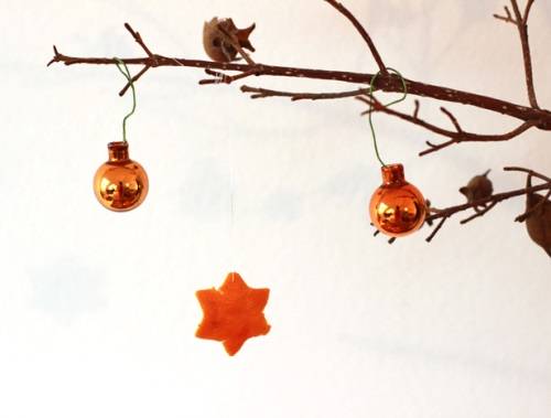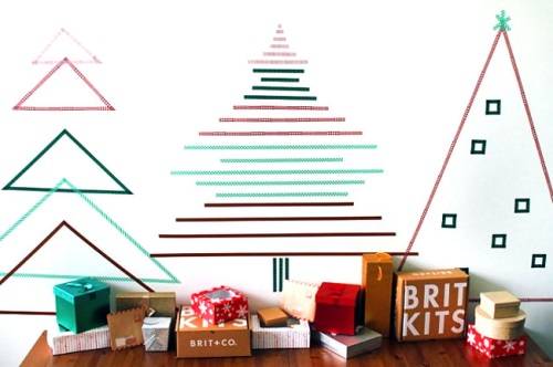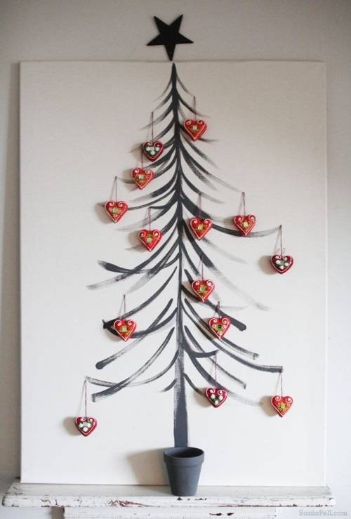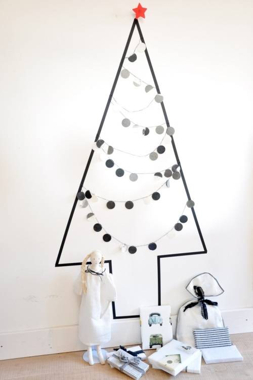 Для более креативного подхода вы можете использовать сухие ветки лиственных растений или же изобразить фигуру елки прямо на стене, как это показано на фотографиях ниже.