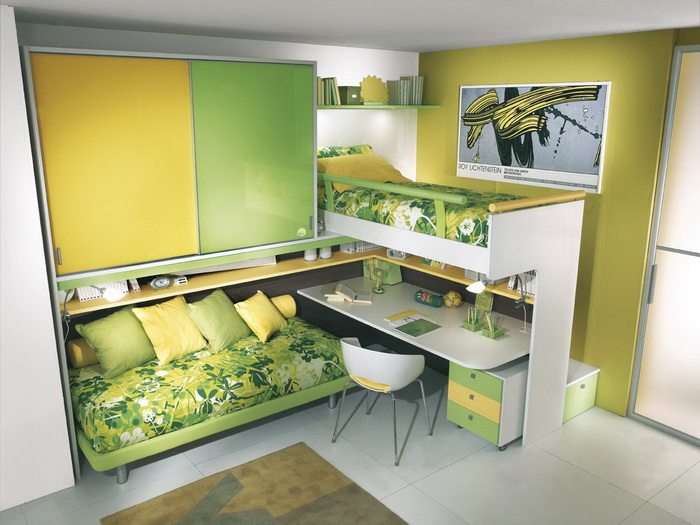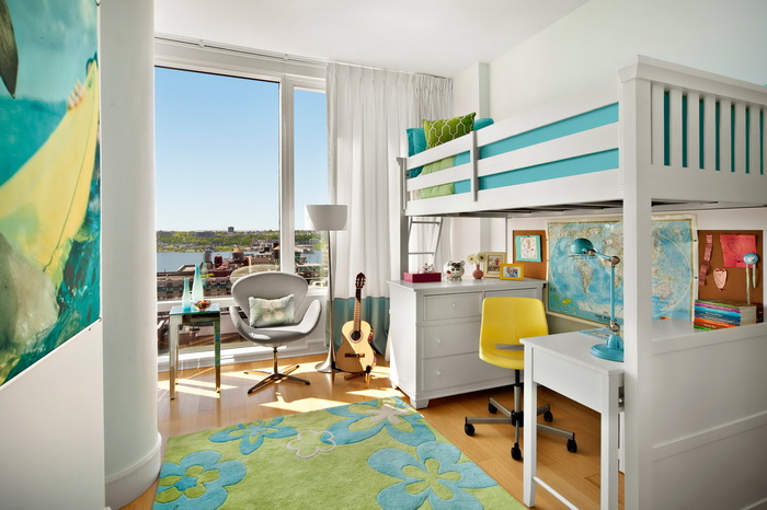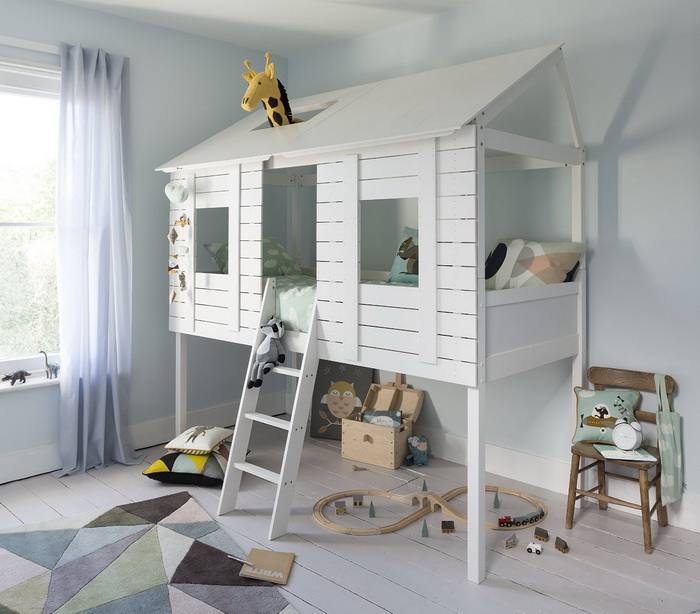 Как вариант, можно взять комплект из двух кроваток: одна будет под потолком, а вторая, традиционно, на полу. Это позволит сделать менее очевидную расстановку. Идея проста, а смотрится оригинально.