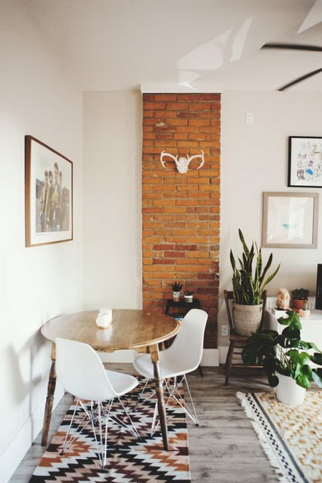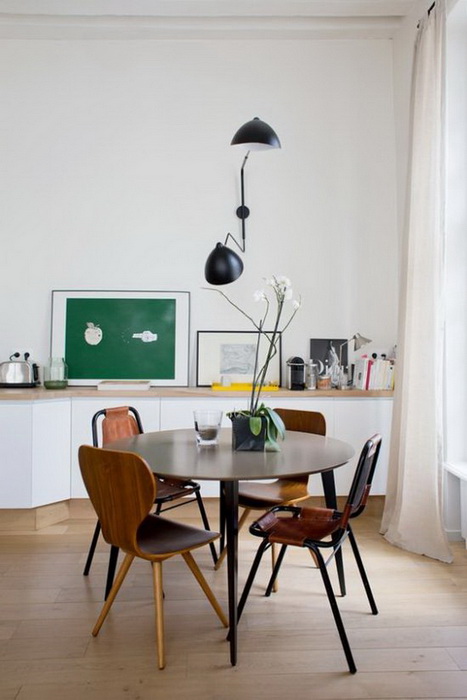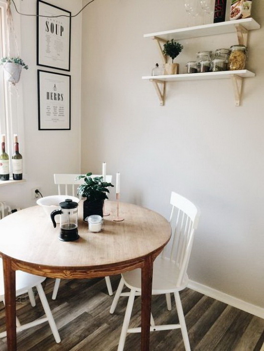 Здесь важно помнить, что круглые столы, как правило, требуют свободного размещения. Конечно, можно придвинуть его к стене, но это решение лишит обеденную зону половину посадочных мест. Так, либо Вы покупаете стол средних размеров и придвигаете его к одной из стен (так стол можно отодвинуть и доставить стулья непосредственно перед приходом гостей), или же отдаете предпочтение небольшому столику. Тогда можно будет утверждать, что благодаря форме стола, Вам удалось создать компактную и удобную столовую зону.