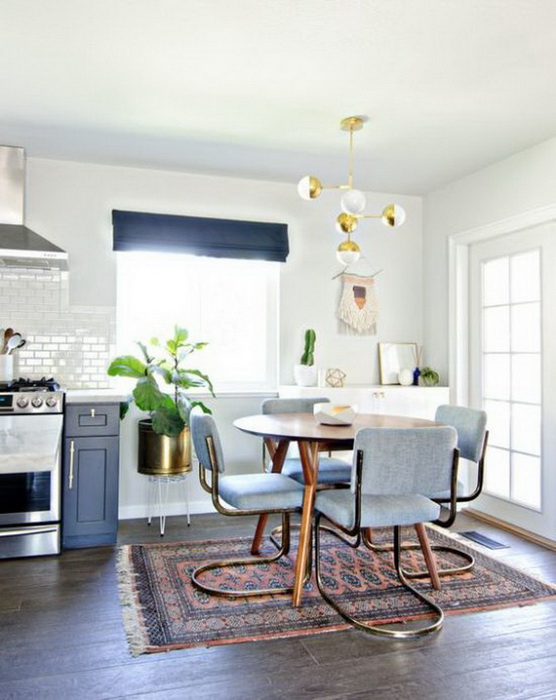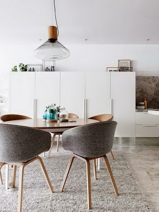 Чтобы столовая имела завершенный вид, а за обеденным столом было комфортно и приятно сидеть, осталось только позаботиться об освещении и выбрать ковер. Ковер — это модно и практично, ведь он защитит пол от повреждений, которые могут нанести ножки стульев.