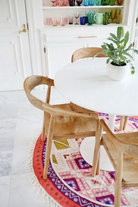 Если стол стоит не у стены и его окружают стулья, лучше всего подобрать круглый ковер. Если же Вы поставили столик у стены, скамьи или углового диванчика, то лучше купить ковер прямоугольной формы.