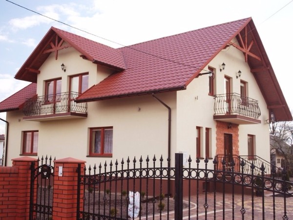 После выполнения необходимых подготовительных работ, можно приступить к укладке самой металлочерепицы. Укладка листов материала начинается с краёв крыши, при этом оставляя выступ в 40 сантиметров. Крепление металлочерепицы к обрешетке выполняется саморезами соответствующего цвета с резиновой прокладкой под головкой. Для удобства, можно пользоваться шуруповёртом или дрелью со специальной битой. Предлагаем вашему вниманию фото домов крыши из металлочерепицы.
