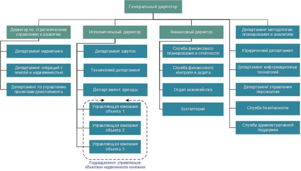 Стандартная структура девелоперской компании, по которой ясно, что выполнять приходится разноплановые задачи