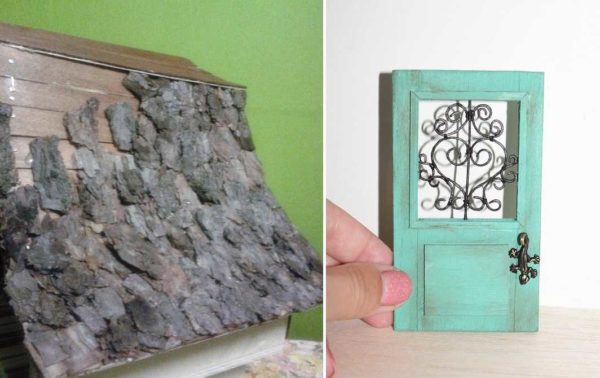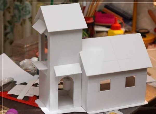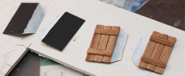 Рамы с переплетами можно сделать из картона белого цвета. Наклеивают их после завершения «отделочных работ». Двери дети любят открывать/закрывать, так что лучше их делать из тонкой фанеры. Крепеж можно найти — есть рояльные петли или маленькие мебельные. Из проволоки и тонких трубочек можно сделать засовы.