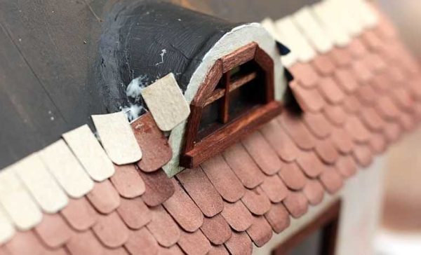 Если нужна крыша сложной формы, из фанеры выпиливаем несколько стропил, которые будут задавать форму.  Их крепим к стенам, обшиваем каким-либо гибким материалом. Это может быть картон, ДВП. Торцы стропил промазывают клеем (лучше — столярным), после чего укладывают материал. Если изгиб слишком крутой, может понадобиться дополнительный крепеж. Обычно используют тоненькие маленькие гвоздики по типу сапожных.