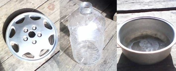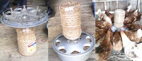 Есть несколько интересных идей. Например, из старого диска для машины, тазика подходящего диаметра и пластикового бутыля для воды емкости 5-10 литров собирается экономная авто-кормушка.