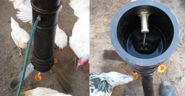 Есть еще интересные идеи от самоделкиных. Например, такая поилка из трубы представлена на фото. В куске пластиковой трубы уровень воды контролируется поплавковым механизмом от бачка унитаза. К труб приделаны три чашечные поилки.