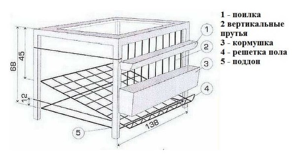 Иногда птицу держат в клетках. Но это при промышленном или полупромышленном содержании. При таком способе выращивания на малой площади обитает большое количество птицы. Чертеж клетки для кур с размерами размещен ниже.