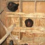 Располагать гнезда лучше так, чтобы вам удобно было забирать яйца, т.е. повесить на стену. Чтобы птица туда смогла спокойно попадать, делают трапики — наклонная доска с прибитыми поперек жердочками/палочками. Такие же трапики делают к насестам. Если гнезда разместить недалеко от насестов и на том же примерно уровне, они будут ходить туда-обратно. Вполне удобно.