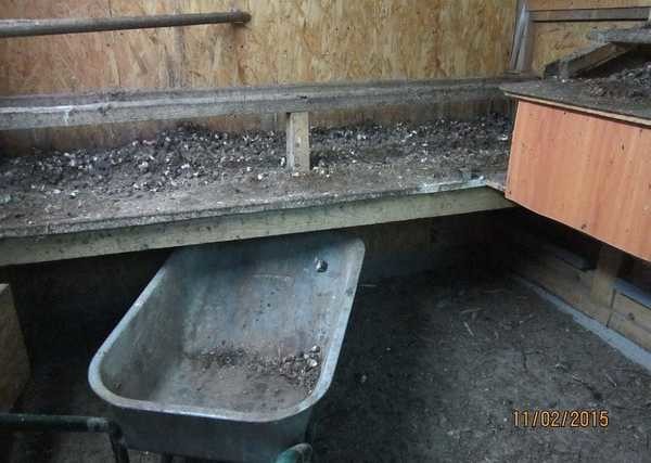 Чтобы проще было убирать, на расстоянии 20 см ниже насеста устанавливают щит из какого-либо гладкого материала. На нем скапливается помет, потому выбирайте гладкую поверхность: проще будет сметать.