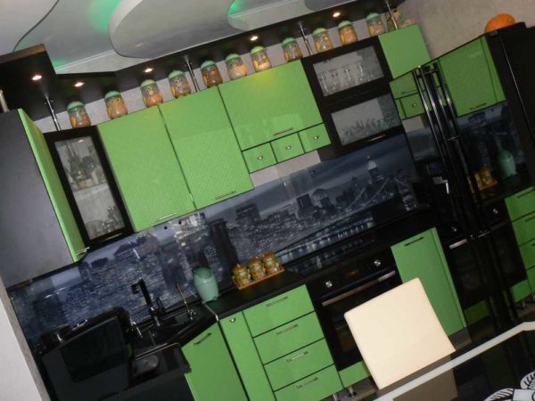 Яркую зелень навесных шкафчиков компенсирует темный фартук и нижние шкафы