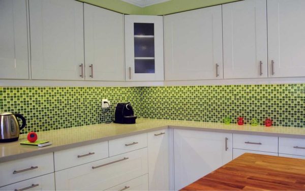 Фартук, стены, столешница — два оттенка зеленого при основном белом