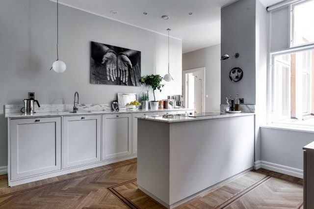 Серый цвет, как элемент контраста в оформлении кухни в скандинавском стиле — тоже классика. Не беспокойтесь, в контексте стиля, серый не будет выглядеть скучно и уныло.
