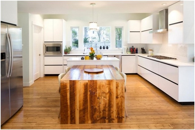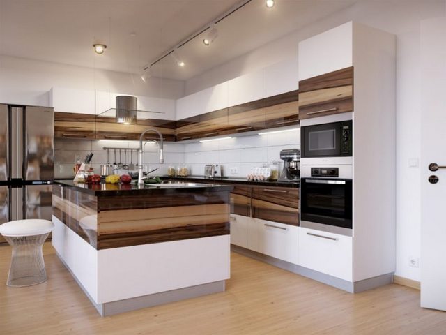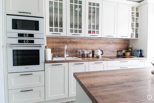 Плюс в том, что оттенки дерева вы можете выбрать какие угодно, соответственно, ваша кухня будет не похожа на все остальные. Нравится такой вариант? Тогда вперёд!