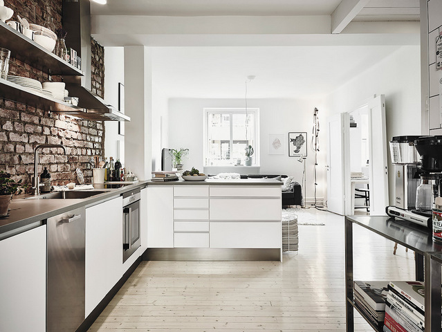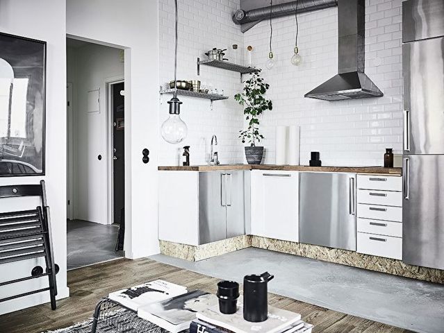 Серый цвет на скандинавской кухне может быть выражен в металле, а соединение металла и дерева — замечательное и стильное решение для кухни, как на этом фото.