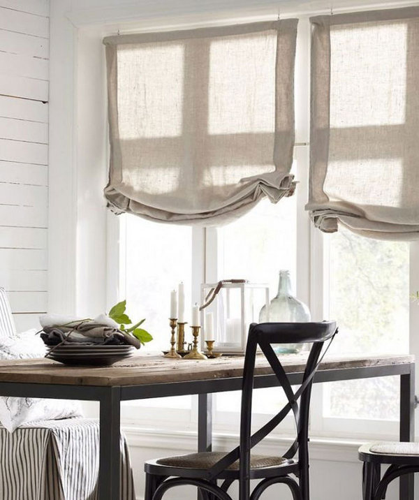 Если же римские шторы вам не по душе, выбирайте стандартные тканевые варианты в пол. Лучшим материалом для скандинавской кухни будет лён, он натурален, выглядит непритязательно и лаконично, а это как раз то, что нам нужно.