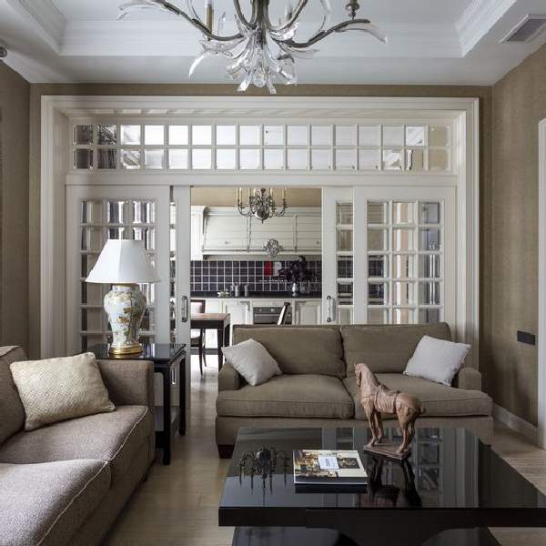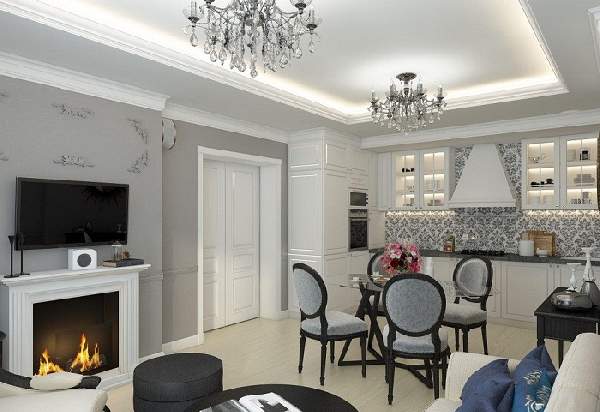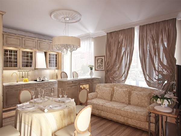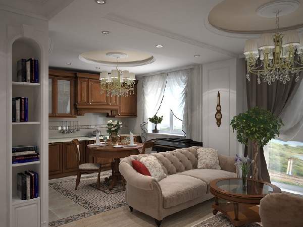 Стоит отметить, что классический стиль более свойственен для больших просторных помещений. Однако оформить дизайн кухни-гостиной 20 кв м в классическом стиле вполне возможно. В первую очередь, стоит обратить внимание на мебель, которая должна быть изготовлена из натуральных качественных материалов. Отделка стен и текстиль имеют светлые тона, возможно, с узорами в виде клетки, полоски или растительного принта. Интересен и более современный дизайн интерьера кухни-гостиной 20 кв м от дизайнера Оксаны Бразицкой, где присутствуют сглаженные формы кухонного гарнитура и красивые классические люстры.