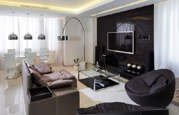 В качестве мебели для отделения территории гостиной выступает диван, который устанавливают тыльной или боковой стороной к рабочей зоне кухни. Можно приобрести большой модульный диван и менять его конфигурацию, как будет удобней. Иногда, в качестве разграничителя, устанавливают тумбу с телевизором.