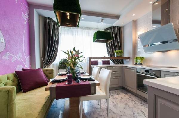 Намного реже встречаются варианты, когда дизайн кухни-гостиной 20 кв м (фото-примеры есть в каталоге) предполагает обустройство в эркерной части рабочей поверхности со столешницей, мойкой и т. д. Это связано с тем, что необходимо переносить коммуникации и вытяжку, что довольно кропотливо и влечет немалые материальные затраты.