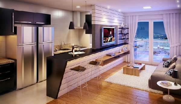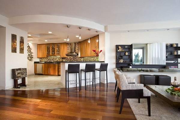 Барную стойку довольно часто применяют для обозначения территории приготовления пищи. Она может быть длинной и служить одновременно обеденным столом, либо иметь меньшие размеры и быть неким декоративным элементом. Кроме того, ее можно оформить на основе фрагмента не до конца демонтированной стены.