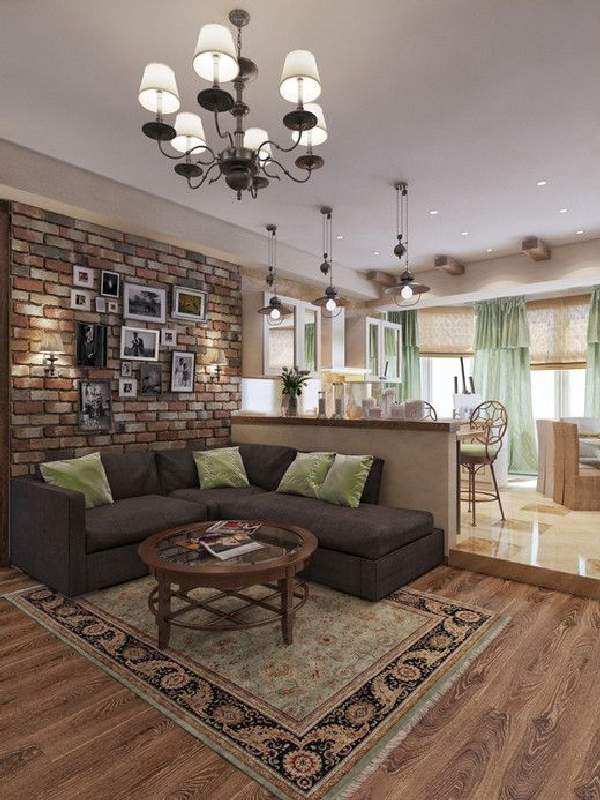 В этом случае отдельные зоны могут быть оформлены разными типами отделочных материалов. Например, напольная поверхность гостиной зоны может иметь ламинат, а на кухне может быть выложена плитка. Стена, возле которой размещен обеденный уголок может быть оформлена фотообоями, в то время как остальная поверхность оштукатурена. Вариантов множество, главное, чтобы все гармонично сочеталось цветовой палитрой и стилем.
