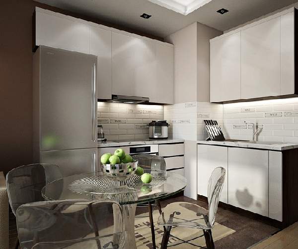 Для рабочей зоны кухни, которая, как правило размещена в дальнем от окна углу, необходимо продумать интенсивное освещение. Гарнитур лучше приобрести встроенный, который будет вмещать в себя всю необходимую технику.