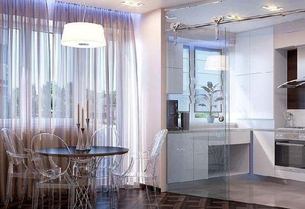 К определенным трудностям можно отнести и покупку мебели, которая должна гармонично сочетаться в одном помещении. Планировка кухни-гостиной 20 кв м (фото-примеры смотрите в нашей статье) может включать в себя оформление раздвижной стеклянной перегородки, которая будет препятствовать проникновению запаха готовящейся пищи в гостиную. При этом визуальное увеличение пространства не нарушится.