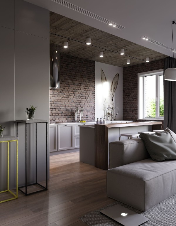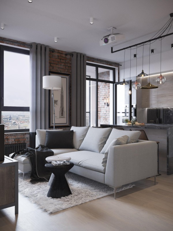 Интерьер гостиной-студии, совмещенной с кухней может быть самым разным по стилю: от сдержанной классики до брутального лофта.