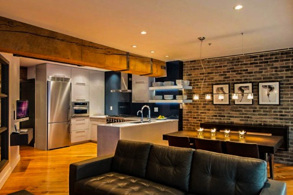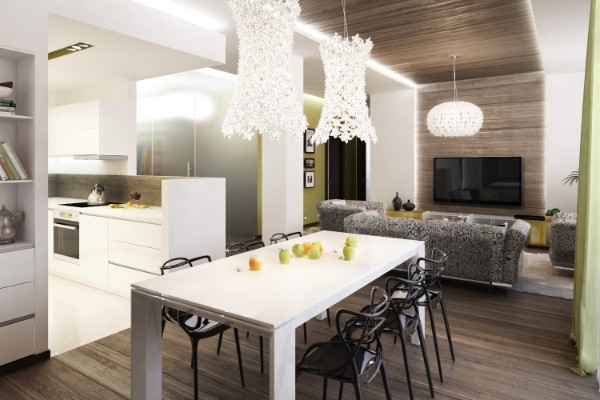 В зоне отдыха, где расположен диван и обеденный стол, обычно используют люстру. Она может быть отправной точкой всего дизайна или же логичным его завершением. Оригинально смотрятся одинаковые светильники, расположенные над кухней. Вот, как на этих фото.