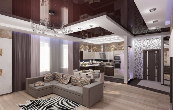 Подчеркнуть разное функциональное назначение отдельных сегментов студии, можно за счет обрамления соответствующего участка на потолке. Это может быть: