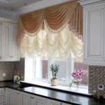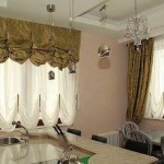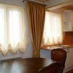 В просторных, высоких кухнях хорошо смотрятся австрийские шторы. В комбинации с основательной мебелью из дерева или под дерево они создают атмосферу стабильности, достатка. Принципы выбора цвета тут классические: светлых тонов полупрозрачные или в цвете близком к цвету мебели плотные ткани.
