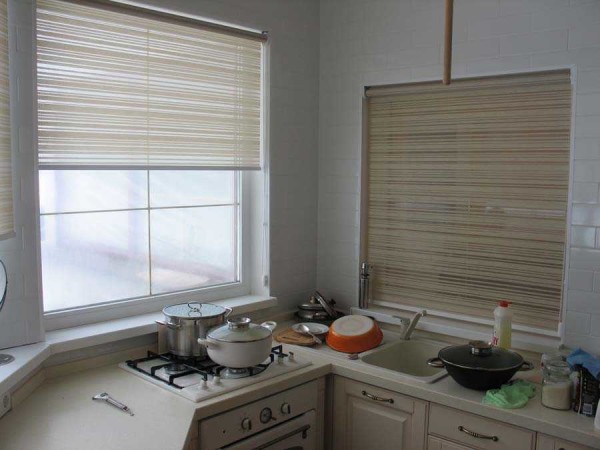 Рулонные или римские шторы на маленькой кухне — оптимальный вариант: места практически не занимают