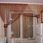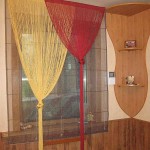 Есть еще один вид оформления окон, которые сложно отнести к какому-нибудь типу. Они появились недавно, и считаются новинкой. Быстро завоевывают популярность, так как выглядят волшебно, как сами, так и в сочетании с другими тканями. Речь идет о нитяных (ниточных, веревочных) шторах. Как понятно из названия, они состоят из отдельных нитей, которые скреплены между собой только в самом верху. Все остальное — свободно свисающие пряди, в которые могут быть вплетены бусины, стеклярус и т.п.