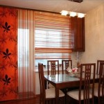 Современные шторы на кухню цветовой палитрой не ограничены. Выбор окраски штор зависит от кухонного интерьера. Они могут быть подобраны в тон мебели, стен или отделки. При этом эффект будет различаться значительно.