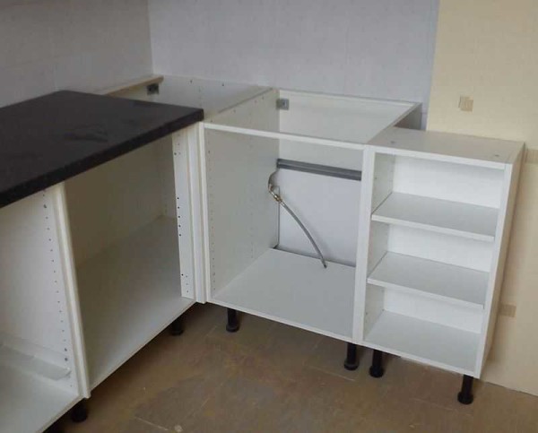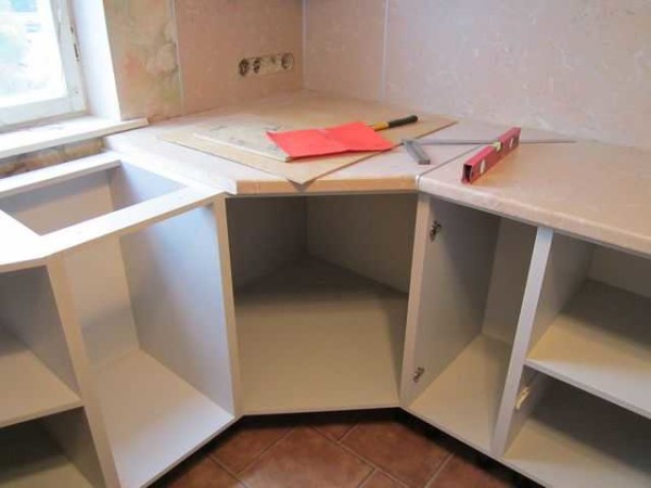 Этот вариант углового шкафа — один из самых неудачных. Когда будут навешены дверки и установлены полностью столешницы, добраться в угол будет очень сложно.
