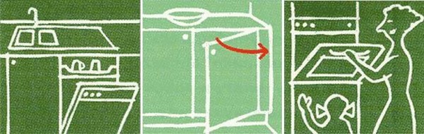 Распашные (№ 1 на фото) и откидные дверцы (№ 2) в открытом состоянии могут быть травмоопасны. Потому их нужно постоянно закрывать. В случае с откидными можно угол открывания сделать не 90° а 110°. Так намного безопаснее.