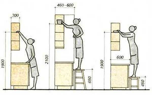 Расстояние от столешницы до нижнего края навесных шкафов — не менее 45 см. Максимум — 60 см. Чаще всего делают 45-50 см. Полки в подвесных шкафчиках располагают так, чтобы хотя бы к двум из них можно было дотянуться. Если планируется делать их под самый потолок, необходима будет стремянка, или табурет-стремянка (есть и такие).