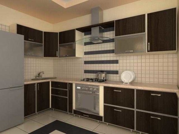- углом — в виде буквы «Г» (угловая или Г-образная кухня) — на двух примыкающих стенах;