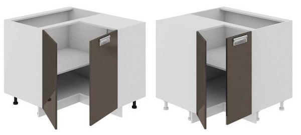 Если кухня угловая — Г-образная или П-образная — нужно правильно организовать именно угол: пространства там много, но использовать его сложно. Можно поставить угловой шкаф. Причем, двери должны открываться по бокам и иметь ширину не менее 40 см. Это даст возможност добираться до самых дальних уголков.