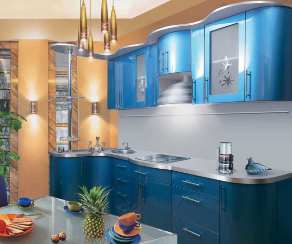 Крашенные кухонные гарнитуры из МДФ — это отличный выбор. Современное разнообразие красок позволяет получить очень красивые поверхности, а нанесенные сверху сверх-прочное лаковое покрытие продлевает срок эксплуатации. Например, фасад, крашенный в голубой цвет с эффектом металлик, видите на фото ниже.