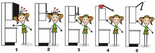Дверцы, параллельно фасаду уезжающие вверх (№ 3), безопасны, но если шкаф разделен горизонтально и дверцы имеет отдельные, то открытый нижний перекрывает доступ к расположенному выше. Откидной фасад (№ 4) удобен, но поднявшаяся вверх створка перекрывает или сбивает предметы, расставленные на шкафах. Часто там стоит декоративная посуда или другие предметы для украшения. Самые удобные — фасады, открывающиеся вверх (№ 5). Для экономии места они могут состоять из двух частей.